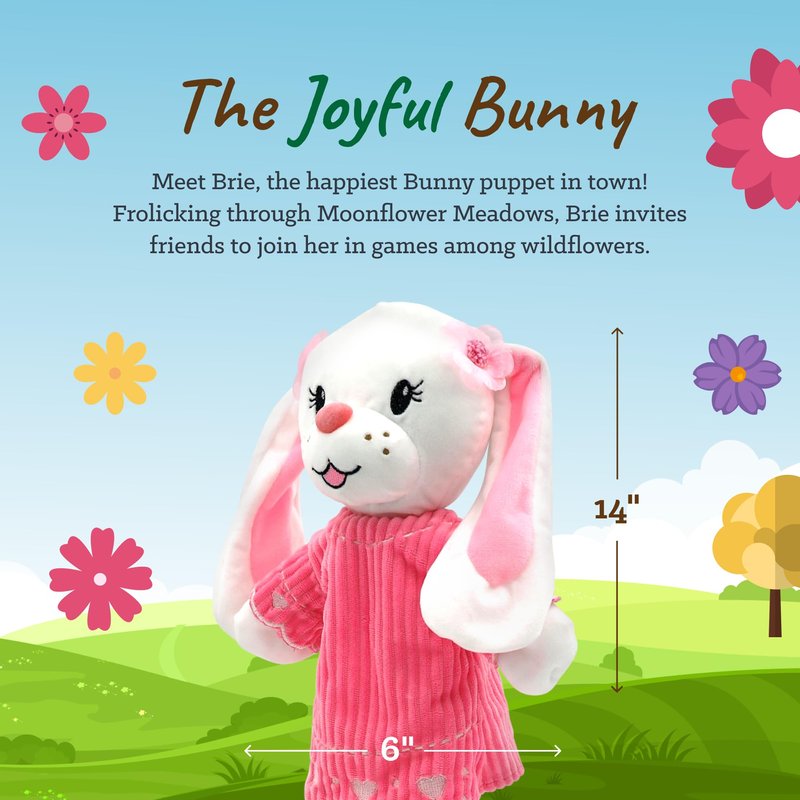 - 🐰Spread Happiness With Brie: Introducing Brie, the happiest Bunny hand puppet you'll ever meet; Brie's greatest joy comes from frolicking through Moonflower Meadows, leaping and bouncing with joy; Her playful nature invites friends to join her in games amidst the stunning wildflowers, and she spreads cheer as she cheers them on in both their games and their lives
