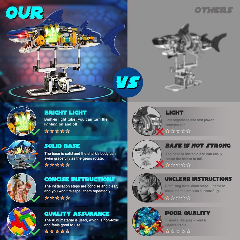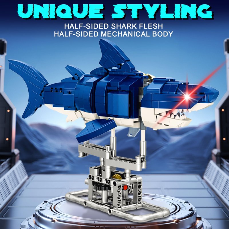 - 【Multifunctional Design】: Combining technological elements and marine animal themes, this shark building block set offers multiple functions. Not only can you build a unique cyberpunk style shark model, but it also comes with lighting effects and a display stand to make the pieces more vivid and eye-catching.