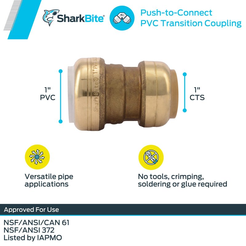 - EASY TO INSTALL: The SharkBite brass transition coupling features a push-to-connect mechanism for a watertight union, and allows for quick and easy installation, with no tools, crimping, glue, or soldering required; can be installed in wet lines