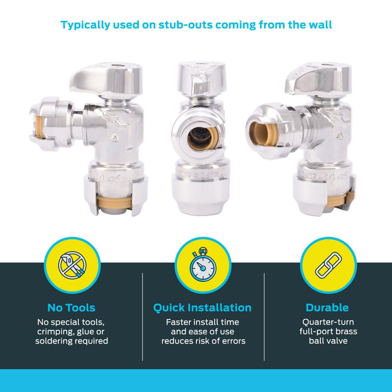 - EASY TO INSTALL: This innovative stop valve features a 1/2-inch push-to-connect inlet and a quarter-turn full-port brass ball valve for quick and easy operation; no special tools, crimping, glue, or soldering needed; can be installed in wet lines