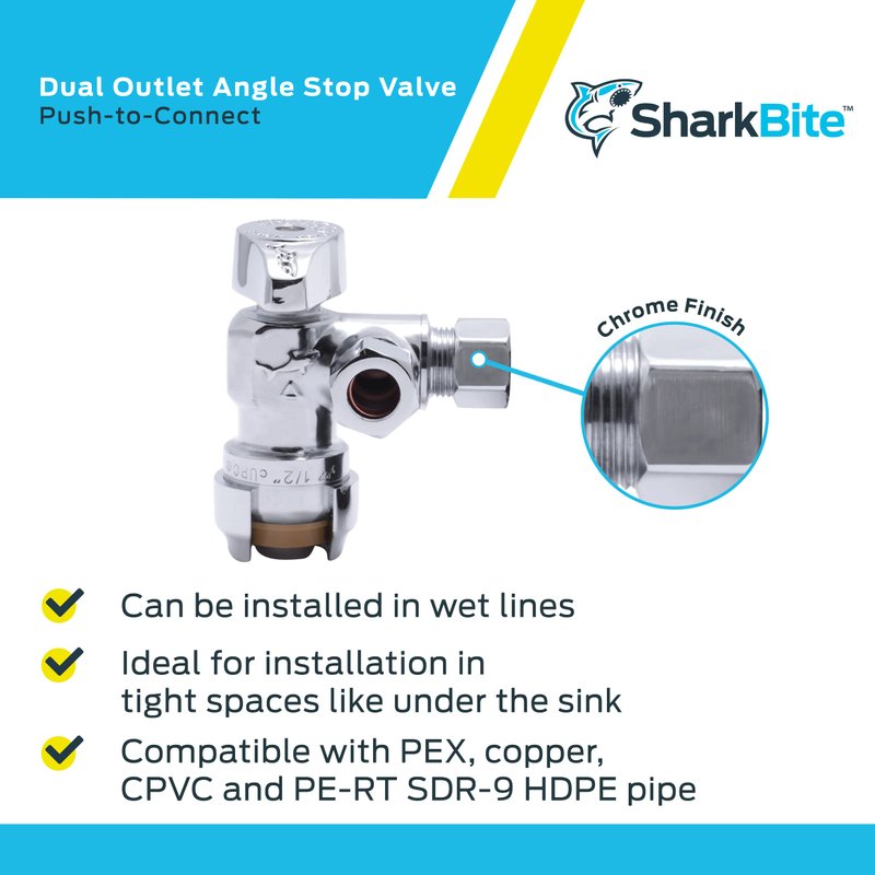 - SHARKBITE BRASS PUSH DUAL OUTLET ANGLE STOP VALVE: Brass push angle stop valves are used to control and shut off water flow to fixtures or appliances for maintenance and repair; ideal for working in tight spaces; remove using a disconnect clip or disconnect tongs