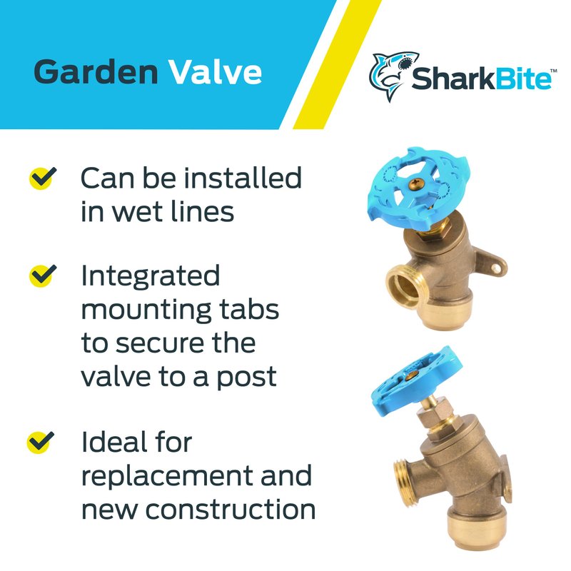 - SHARKBITE BRASS PUSH GARDEN VALVE: Multi-turn shut-off valve with mounting tabs and angled handle can be used for water flow regulation; ideal for working in tight spaces; combines a 3/4 inch garden hose outlet with a 1/2 inch or 3/4 inch push-to-connect inlet