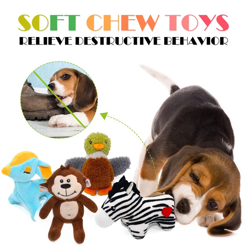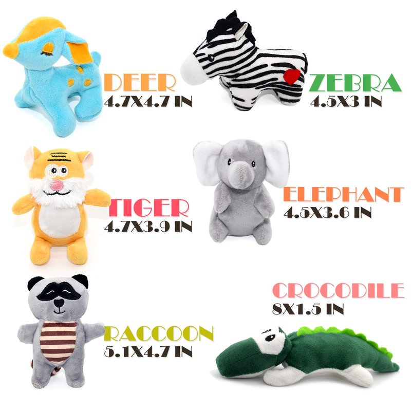 - CUTE DOG TOYS FOR SMALL DOGS: Give your dogs a lovely squeaky zoo dog toy! Our dog toy pack has soft plush fur, with floppy paws and sewn facial features by hand-stitched. These exclusive dog chew toys stuffing with squeakers include fox dog toy, tiger, deer, rabbit, crocodile, panda, zebra, elephant, penguin, racoon,monkey and duck dog toy, they are designed for jungles of fun for your small dogs and puppies