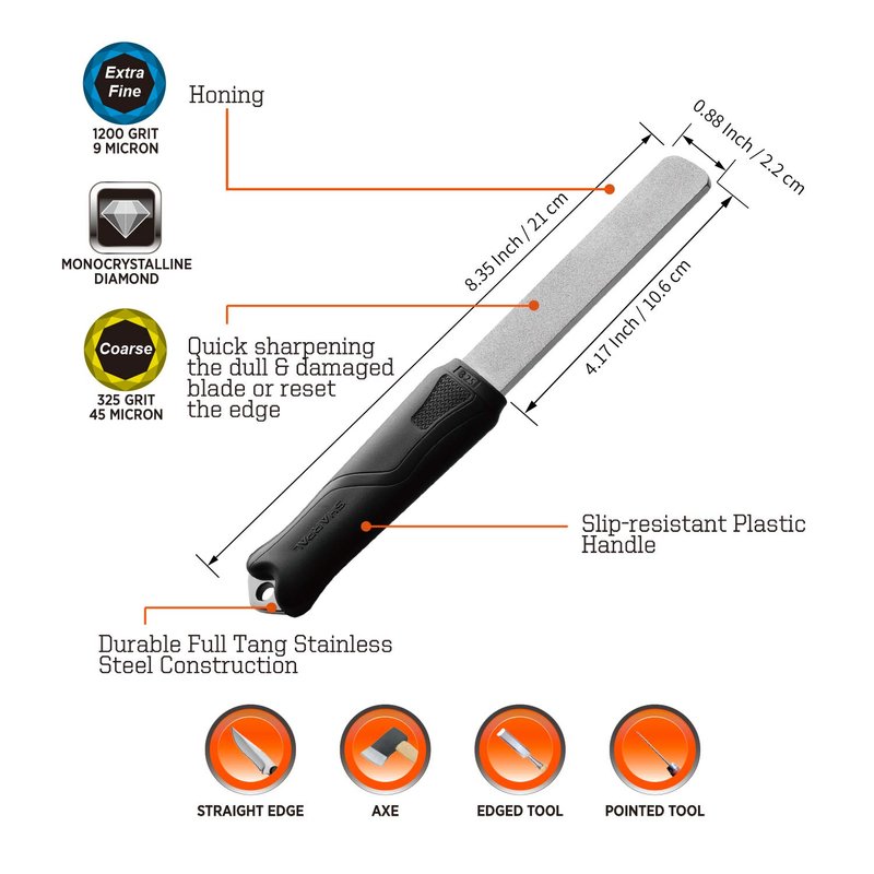 - Durable monocrystalline diamonds coated full tang stainless steel. The diamond coating of this product has a very high hardness. It can sharpen all your tools like new ones.
