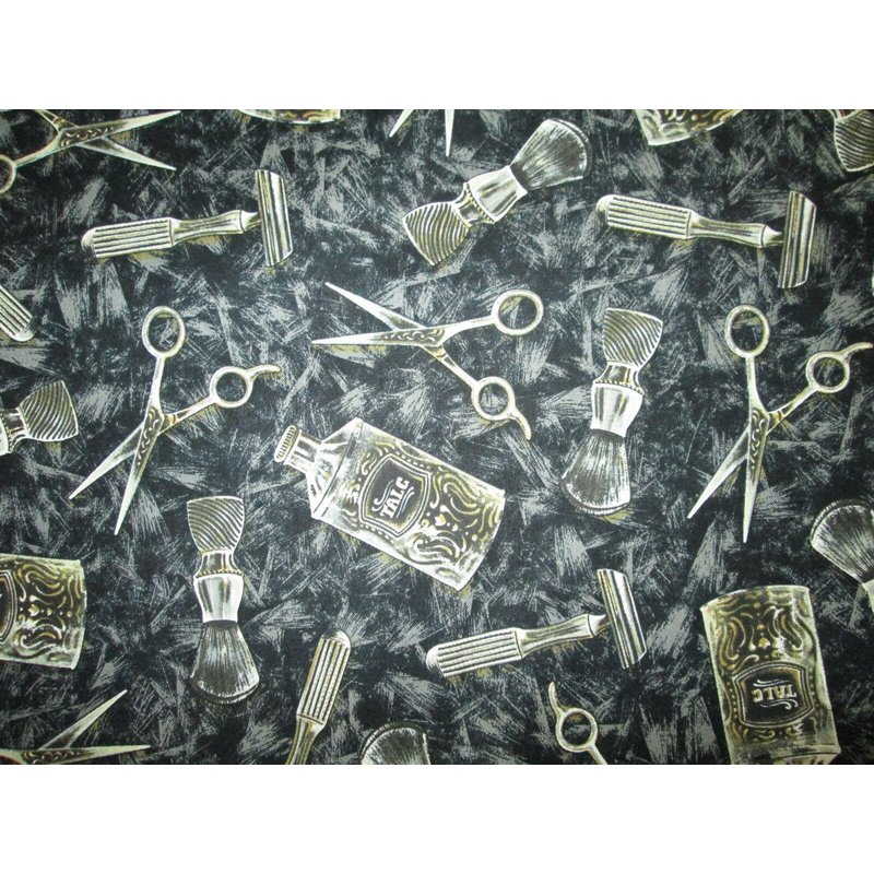 - Item Specifics: Material :cotton Lic Cotton Print Width: 22 Amount: FQ 18 Inch This is for one Fat Quarter measuring 18 by 22 inches of neat print of Men's Saving Items - including scissors, a brush, talc and more on a Black Background! This is a fun and unusual fabric