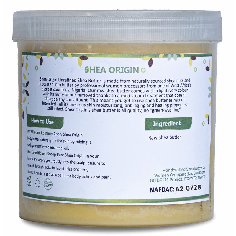 Shea Origin Unrefined Shea Butter is made from naturally sourced shea nuts in Africa and processed into butter by professional shea butter processors from one of West Africa’s biggest countries, Nigeria. Our raw shea butter comes with a light ivory color with its nutty odor removed thanks to a mild steam treatment that doesn’t degrade any constituent. This means you get to use shea butter as nature intended - all its precious skin moisturizing, anti-aging, and healing properties are still intact. Shea Origin's shea butter is all quality, with no “green-washing”. Our natural raw shea butter is a natural remedy to skin conditions such as eczema, sunburn, rashes, and peeling and offers relief within the shortest period of time. It also fades wrinkles, stretch marks scars, and blemishes which can damage the skin’s natural texture. Our pure shea butter is a natural moisturizer that is smooth on the skin and absorbs easily leaving no residue when applied.