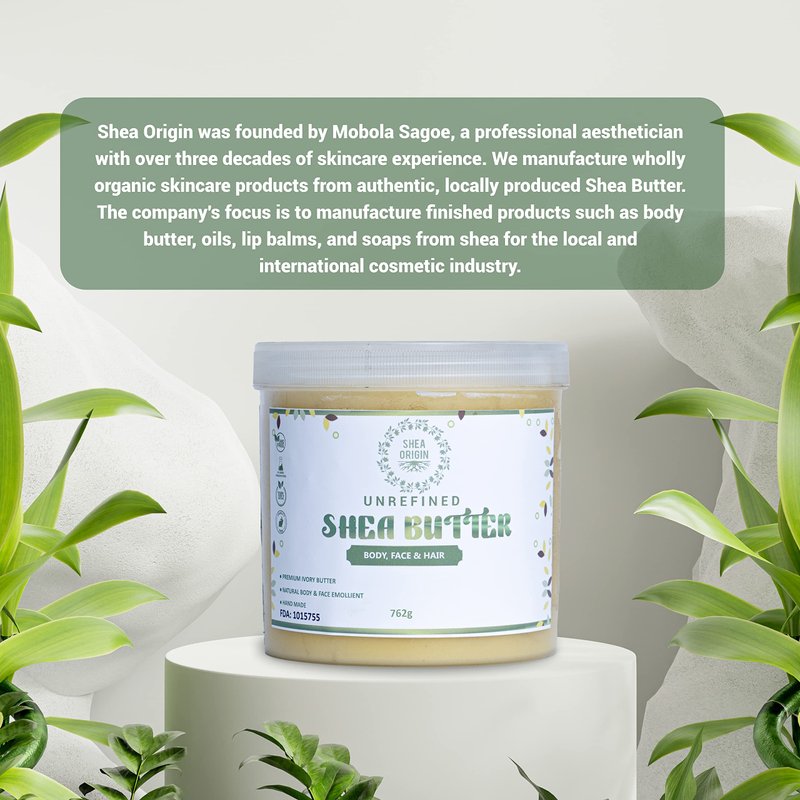 About Us Shea Origin was founded by Mobola Sagoe, a professional aesthetician with over three decades of skincare experience. We manufacture wholly natural skincare products from authentic, locally produced Shea Butter. The company’s focus is to manufacture finished products such as body butter, oils, lip balms, and soaps from Shea for the local and international cosmetic industry.