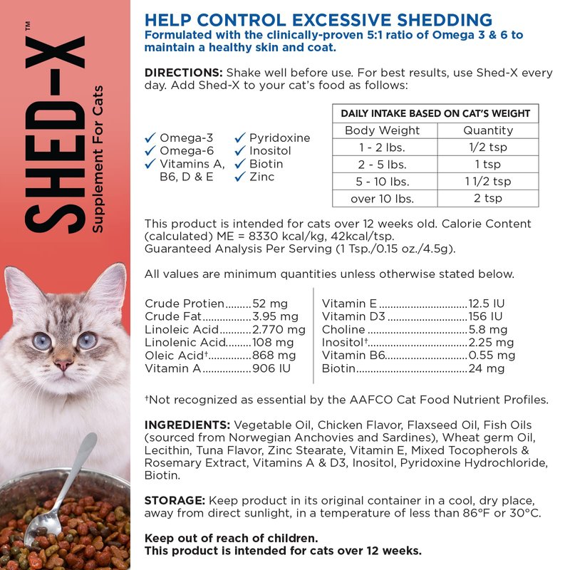 Shed-X Liquid Cat Supplement, 8oz – 100% Natural – Shed Defender, Help Excessive Cat Shedding with Cat Supplements of Essential Fatty Acids, Vitamins, and Minerals