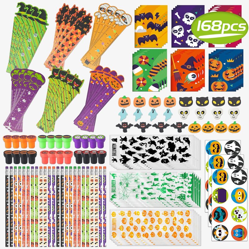 Shemira Halloween Party Favors for Kids,168pcs Halloween Stationery gift kit,Halloween Miniatures Prizes,Trick or Treating Goodie Bag Fillers including Notepad,Stamper,Sticker,Pencil,Eraser,Ruler