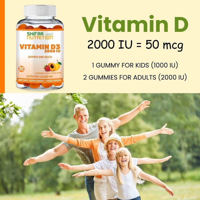 SHIFAA NUTRITION Vitamin D3 Gummies Help Support Bone, Muscle, and Immune Health. The Bottle Contains Three Delicious, Naturally Derived Flavors of Gummies including Strawberry, Peach, and Mango. The Gummies are Halal and Vegetarian and Do Not Contain Gelatin.