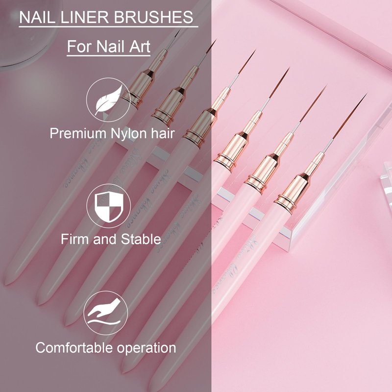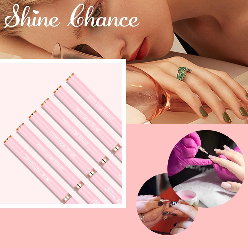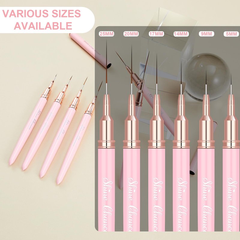 - 💗【Professional Nail Liner Brushes】: This art nail brushes comes with 6 pcs different size: 5mm, 9mm, 14mm, 17mm, 20mm and 25mm. Meets various of different nail art needs. Perfect for tiny details, delicate and exquisite patterns, fine lines of nail designs. It's super suitable for professional nail salons or beginners diy at home.