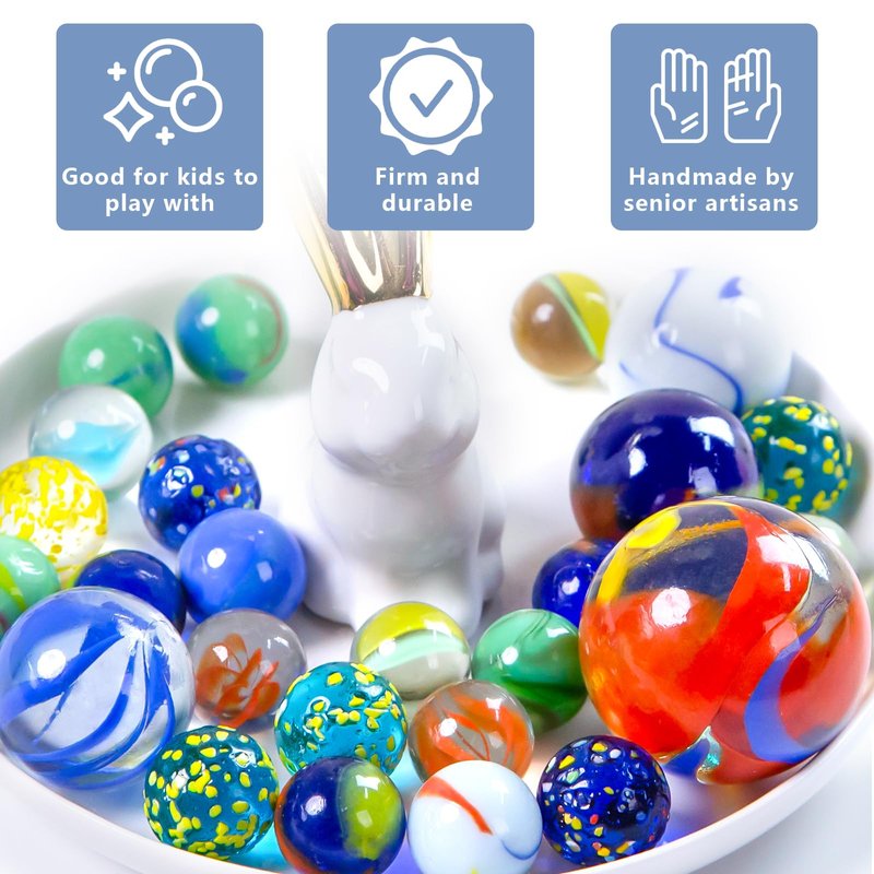 - Handmade - These round marbles are all made of high quality glass, non-toxic and lead-free, handmade by our senior artisans one at a time, durable and reusable.