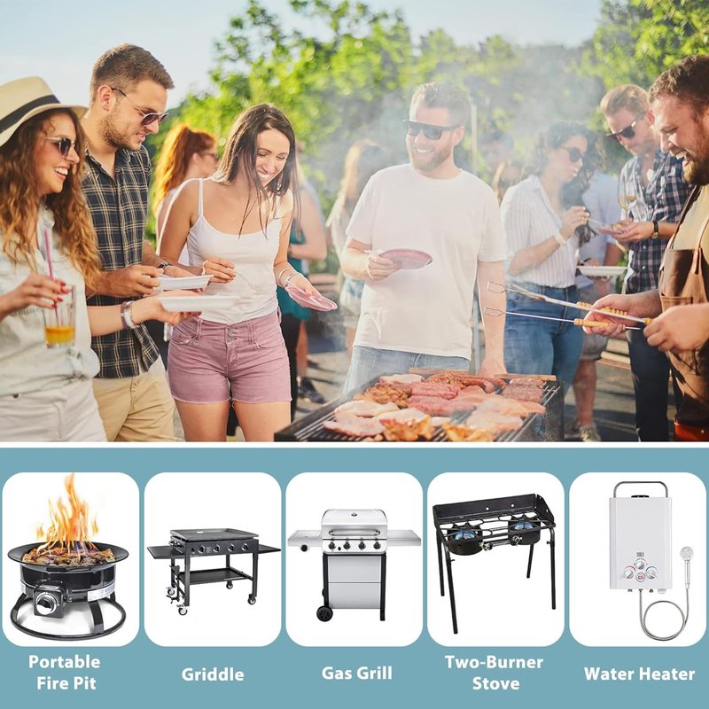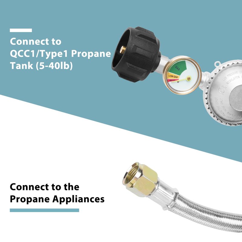 This is upgraded 5ft gas grill regulator hose with propane tank gauge. Do not need to buy extra gas meter, saving your money. 1. Please check to see if the propane tank has the standard propane valve fitting QCC1/Type1, like a Propane Smoker, Gas Grill, Heater, Fire Pit.Then see device if the other end is a 3/8inch Male Flare Fitting. 2. The output pressure of the regulator is set to 11 inches water column which equates to approximately. 3. Low pressure means the high pressure in your propane tank will be reduced and regulated to the correct pressure for your burners to work as designed. 4. Great for BBQ, camping, tailgating, heating needs or having an outdoor cookout. 5. Our propane regulator with hose has excess flow protection for your safety and will automatically shut off. Attention: 1.Keeping the hose away from HIGH TEMPERATURE. 2.FULLY TIGHTENED at both propane tank side and grill side before using on your propane appliances to prevent leakage. 3.To check and make sure the hose is away from the OPEN FIRE before installing to your appliances. Product Specification: Outlet Pressure:11’’W.C. Flow Capacity: 80000 BTU/Hr Length: 5 feet /60 inch(length of rubber hose only) Please double check your appliance connection if is 3/8’’ Male Flare Fitting Connector. Note: For Outdoor Use Only.