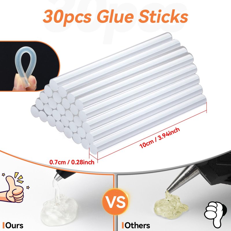 - 【Extra 30PCS Glue Sticks】Our glue gun kit provides 30 pieces transparent glue sticks(7.0mm x 100mm), Perfect for home, office and school DIY crafts like metal, wood, glass, card, fabric, plastic, ceramics etc.
