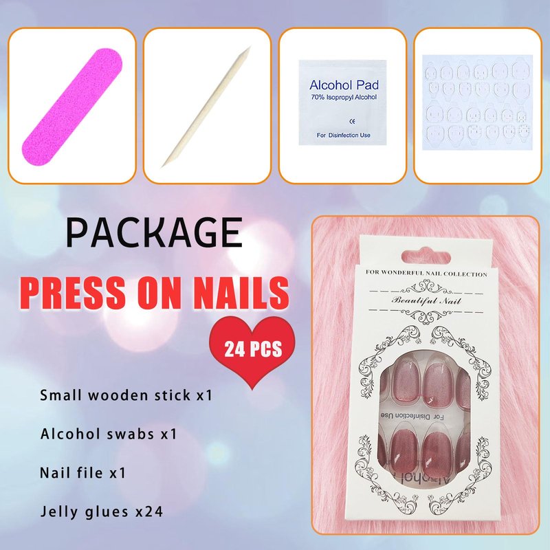 - You Will Get: The package contains 24 pieces of short oval press on nails of different sizes, 1 mini nail file, 1 small wooden stick, and 1 piece of nail glue sticker. (Jelly glue can last about 3 days or more, glue remains longer)