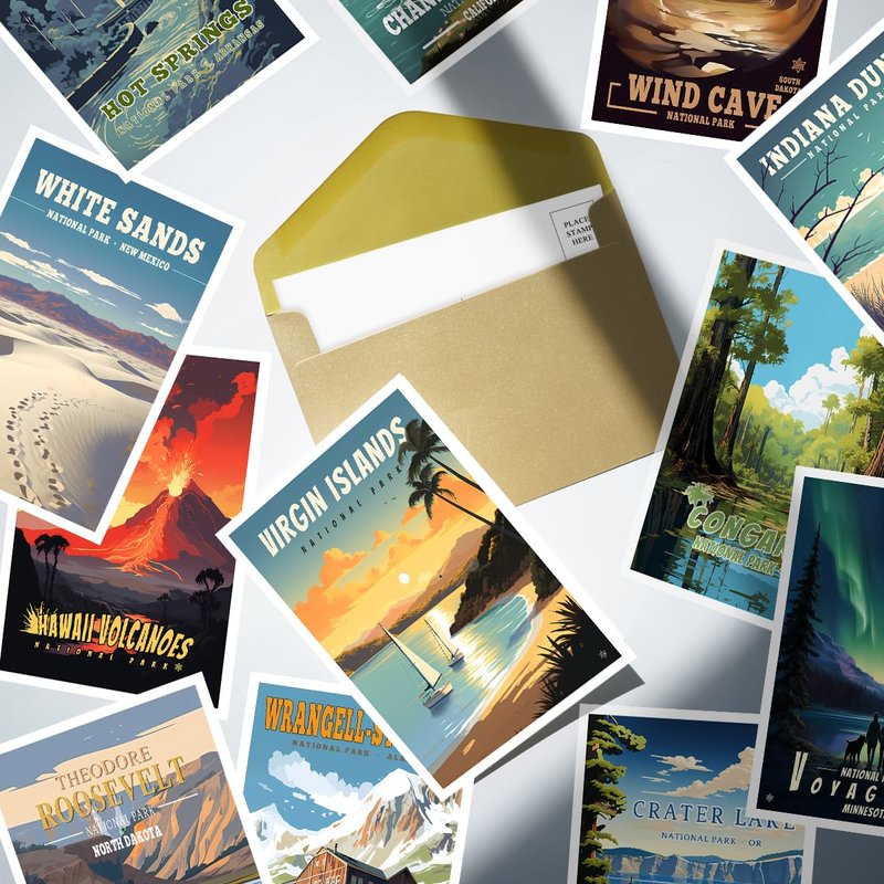 - Retro Charm: Inspired by vintage travel posters, these postcards bring the adventure and beauty of national parks right to your doorstep or wall.