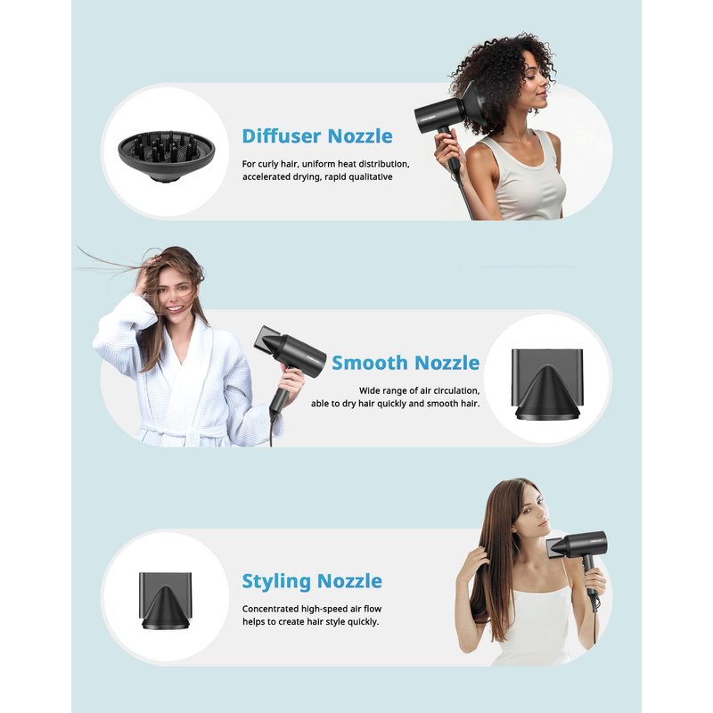 • ใ€๐“๐ก๐ซ๐ž๐ž ๐๐จ๐ณ๐ณ๐ฅ๐ž ๐€๐ญ๐ญ๐š๐œ๐ก๐ฆ๐ž๐ง๐ญ๐ฌ: ๐Œ๐š๐ฌ๐ญ๐ž๐ซ ๐€๐ฅ๐ฅ ๐‡๐š๐ข๐ซ๐ฌ๐ญ๐ฒ๐ฅ๐ž ๐˜๐จ๐ฎ ๐–๐š๐ง๐ญใ€‘Our SHRATE hair dryer comes with three different nozzle attachments, a diffuser nozzle, a smooth nozzle and a styling nozzle. Whether you want natural curls, silky smooth hair, or sophisticated styling, we've got you covered. Use diffuser nozzle for voluminous curls, smooth nozzle for sleek hair and styling nozzle for versatile styles. With SHRATE, turn your daily routine into a masterpiece of hairstyling versatility, with each nozzle attachment designed to help you effortlessly achieve the look you want