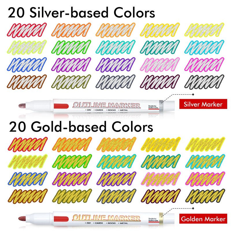- 【40 Vibrant Colors】: This pack of Shuttle Art Outline Markers contains 20 silver-based and 20 gold-based metallic outline markers. Dual -color effect with vibrant colors is the perfect choice for designing greeting cards and DIY crafts.