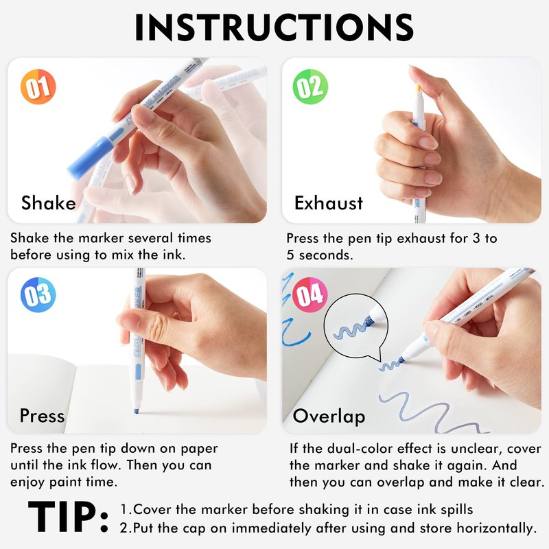 - 【Easy to Use】:With the cap on, shake the marker several times. And press the pen tip exhaust for 3 to 5 seconds. Then press the pen tip down on paper until the ink flow. Please put the cap on immediately after using and store horizontally.
