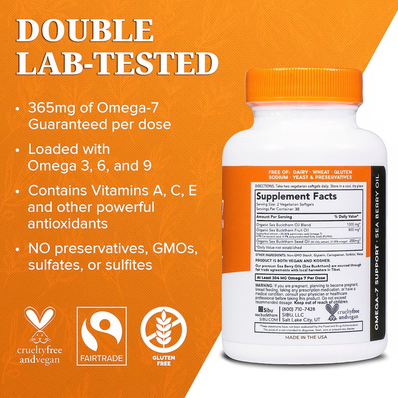 - 365mg OMEGA 7 – Sibu's sea buckthorn superfruit supplement guarantees 365mg Omega-7 and is loaded with Omega 3, 6, and 9, Vitamins A, C, and E, and other powerful antioxidants. Our ingredients are supercritical CO2 extracted, the gold standard in oil extraction. NO preservatives, GMOs, sulfates, or sulfites.
