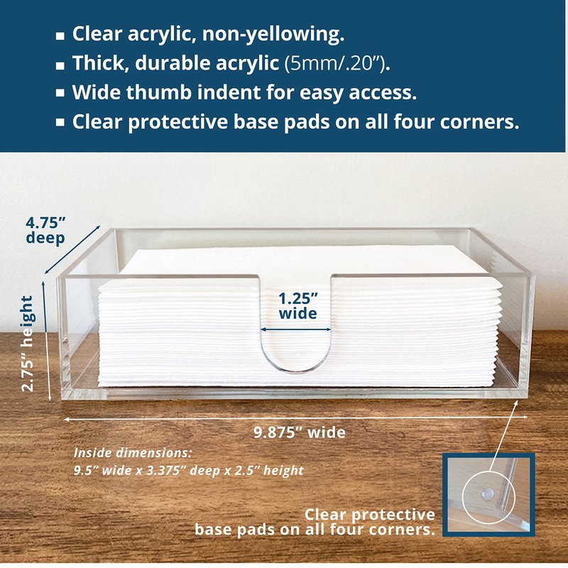 This versatile guest towel napkin caddy with its crystal-clear profile complements your kitchen or bathroom decor or wedding color palette. Use it with decorative paper napkins on a banquet table, or make fingertip towels available in your powder room. Guests to your home, restaurant clients and wedding attendees will be impressed to have fresh individual towels at their disposal, and you can relax knowing that your serving line or bathroom will be immaculately maintained and hygienic, visit after visit.