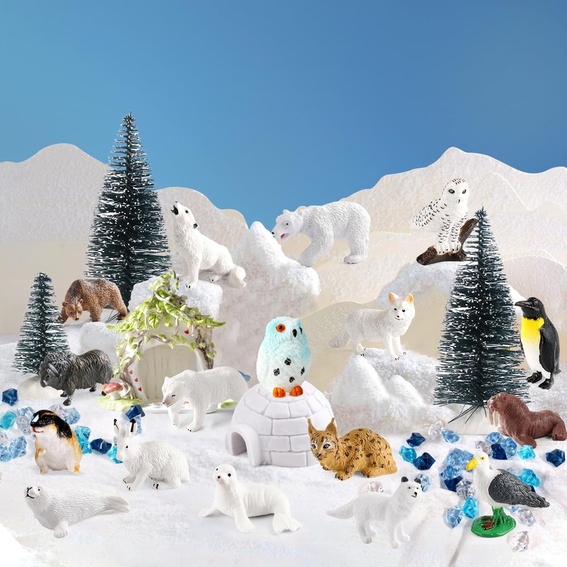 - 【Polar Animal Habitat Diorama Set】-26pcs Arctic and Antarctic animals includes: mini penguin, Polar Bears, Lemming, Caribou, Musk Ox, Lynx, Glaucous Gull, Atlantic Puffin Bird, Arctic Wolf, Rabbit, Fox, Snowy Owl, Seal, Beluga, Siberian Husky, Reindeer, small Polar Sea animals-Manta, Dolphin, Narwhal and so on. The Polar animal playset also includes 3pcs Model Pine Trees and 30pcs fake ice rocks and 1pc igloo.