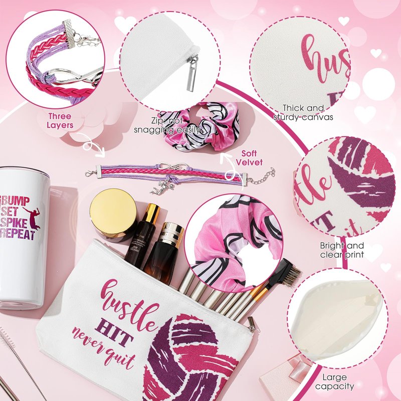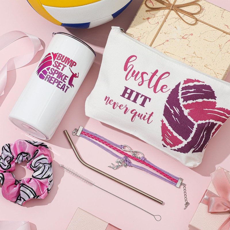 - Nice Combination: this package comes with 4 pieces set of volley gifts, including 1 piece of tumbler cup, 1 piece of scrunchie, 1 piece of makeup bag and a piece of bracelet, this combination is nice to meet your daily usage and replacement needs