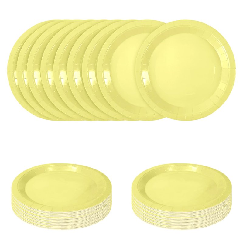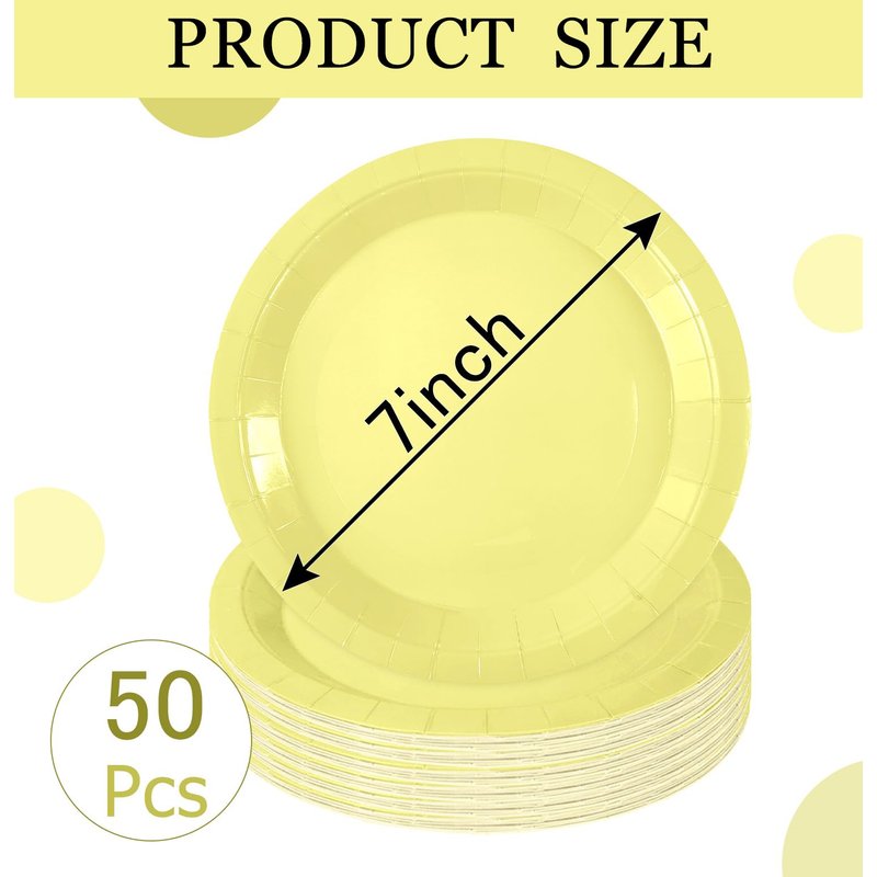- About our dessert plates: You will get 50 pcs yellow party plates and the size is 7 inches. The yellow paper plates are large enough and the quantity is also enough for you to use at the party
