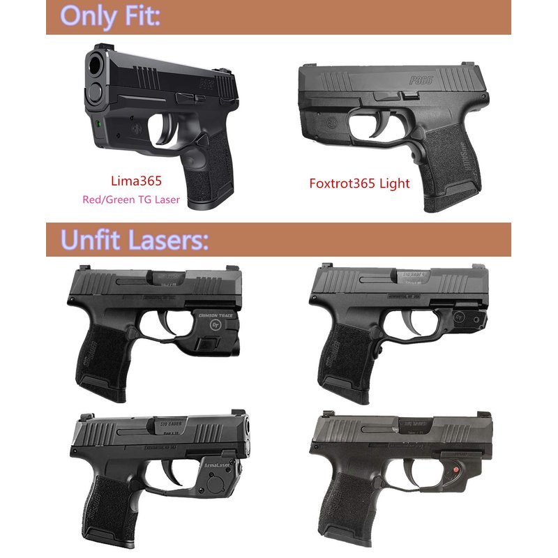 - Compatible & Incompatible: Compatible with sig p365 lima365 laser sight, sig p365 foxtrot365 light; Incompatible with sig p365xl laser, p365sas laser, p365 other laser. The bottom of the holster has a lip to prevent longer barrel sticking out.