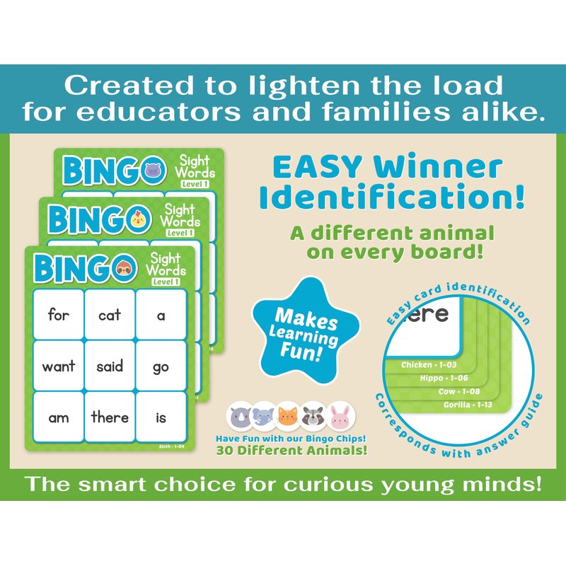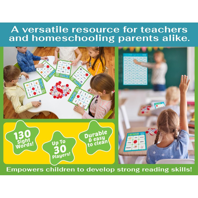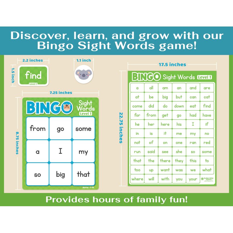 - Our word flash cards for kids ages 4-8 Level 1&2 include 30 double sided Bingo Cards 7.25 x 8.75 inches; 65 double sided Calling Cards plus 10 Challenges; 276 durable plastic Bingo Chips; 1 large Sight Word poster 17.5 x 22.75 inches and 1 Instruction page