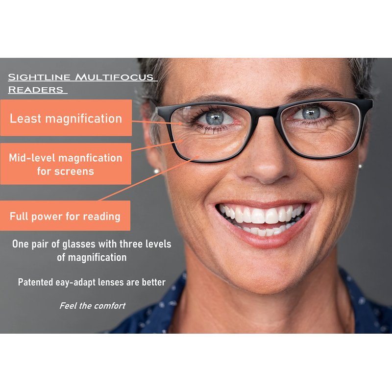 - Use reading glasses? Ever tried multi-focus lenses? They are a revelation. Stop popping your readers onto the top of your head all the time. Stop taking your readers on and off incessantly. Stop bobbing your head to look up and over your reading glasses- that is a pain in the neck, am I right? Start using Sightline Readers, and “Feel the Comfort”. Sightline is the one pair you will always want to wear!