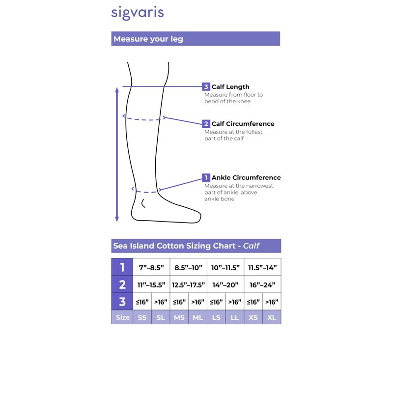 The Sigvaris Style Sea Island Cotton collection is best suited for tired, heavy, restless, aching legs and for travelers, those with occupational leg health risks, expecting mothers, and for those with a family history of vein issues.