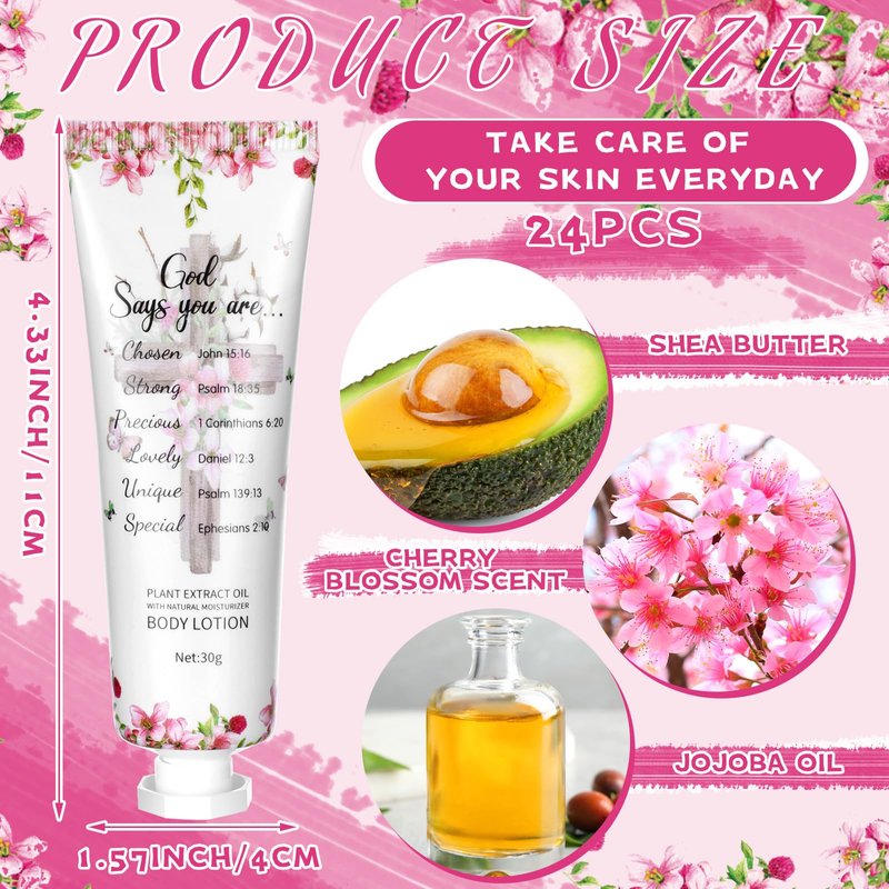 - Christian Body Lotion Gift Set: this gift set contains 24 cherry blossom scented Christian body lotions, about 1.01 oz/ 30 g in capacity, enough to last the entire holiday; Each lotion is carefully crafted with plant ingredients making it nutritious for your skin and kind to the space
