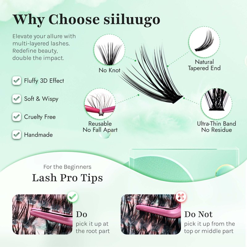 - 🤩【Refuse Falling Apart With SIILUUGO Cluster Lashes】Compared with other lash clusters, our lash clusters band is stronger and thinner. So you will feel easier and more comfortable when using the DIY cluster lashes. Easy to pick up without falling apart, soft and comfortable to wear.