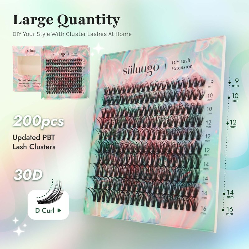 Specification: Name:DIY LASH EXTENSION Brand:siiluugo Type: D Curl 30D 0.07 fluffy individual lashes clusters Style:Wispy,Natural look false eyelashes and Volume look pestañas pelo a pelo Length: 9mm 10mm 12mm 14mm 16mm mixed length lash clusters Cluster: 200 PCS natural look faux mink PBT eyelash clusters Package including: 200 PCS mixed curl lengths Clusters Eyelash How to use STEP 1:Curl your natural lashes STEP 2:Brush the roots of your natural eyelashes with a thin layer of BOND. A little goes a long way! STEP 3:One by one, use LASH APPLICATOR gently place the lash clusters under the base of your natural lashes, slightly away from the eyelid. STEP 4:Dab on a thin layer of SEAL under the cluster this final touch eliminates any sticky residue and locks the band, holding the cluster in place! How to remove STEP 1:Take a cotton pad and drop in the right amount of remover (hold for 10 seconds). STEP 2:Gently rub to remove clusters, Lash bond&seal. Tip:Repeat as necessary until there are no more residues left. You can use it at weddings, parties, work, dates, birthdays, picnics/parties, etc. Why choose siiluugo? - Natural results - Time-saving solution - Safe and gentle - Easy to put on & remove - Waterproof - Comfortable and Soft - Reusable - High Quality Lashes,No irritation and allergy - Beginner & Proficients Friendly - 100% Responsible After-sales Service Notes: Pick up the cluster from root and remove lashes from the tray