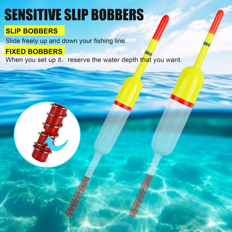 - PRACTICAL FUNCTION: Slip bobber for fishing are lightweight and sensitive,Very responsive when the fish takes the bait.slide freely up and down your fishing line,work great for fishing in a variety of situation and depths.