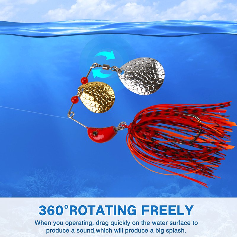 - COMPONENT: Spinner Baits come with double colorado blade enhance flash and vibration, Hand-tied silicon skirt, loop for line attachment, swinging head, also equipped with rolling swivel and hook