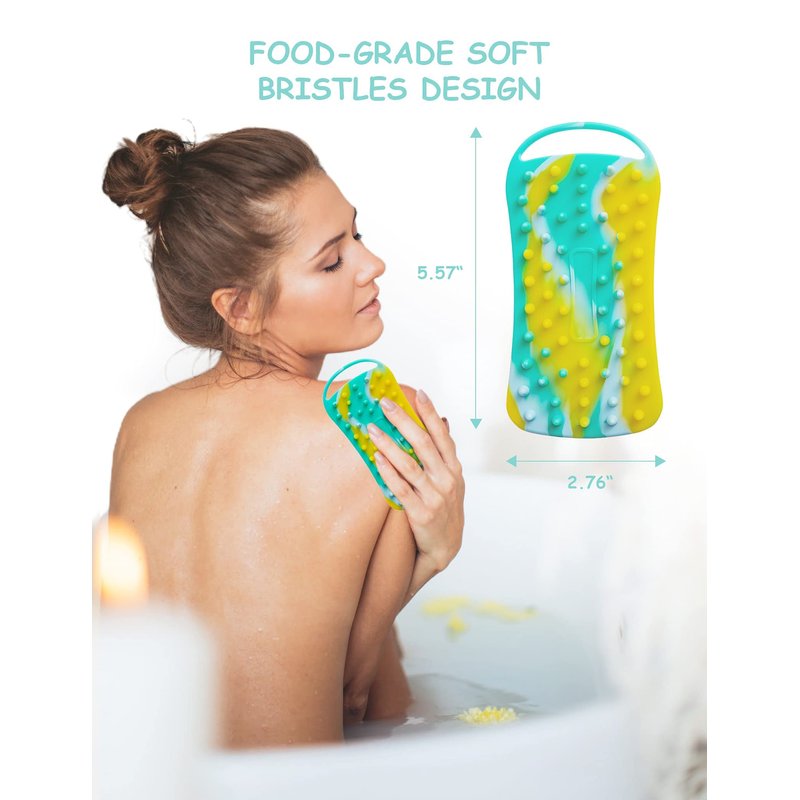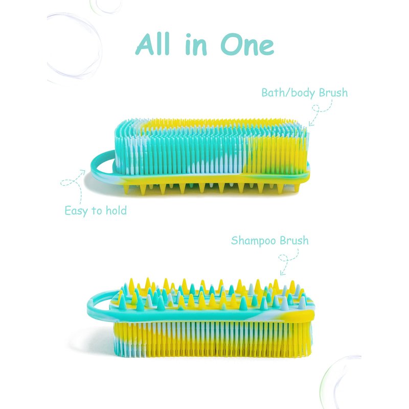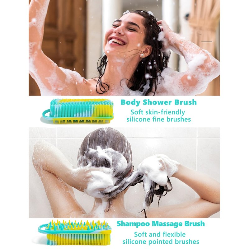 - Unique double-sided design: It is different from traditional silicone body scrubbers. Our bath brush has two sides. One side body scrubbers for use in shower,dry easy, the other side is massaging shampoo brush. Compared with other exfoliating brush, the length of the bristles on one side is appropriately shortened and not easily deformed and can clean the body better.