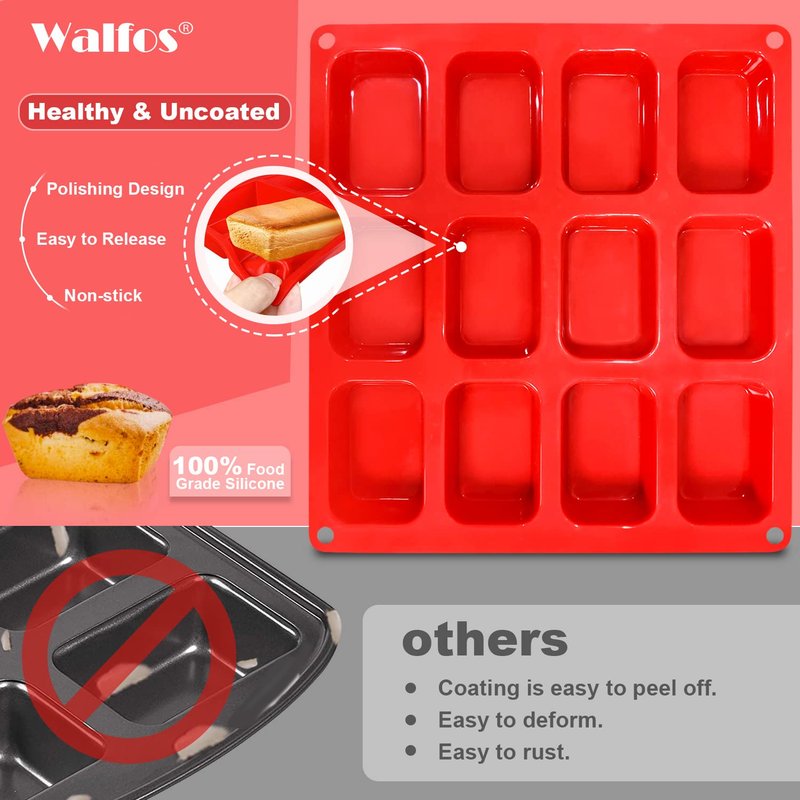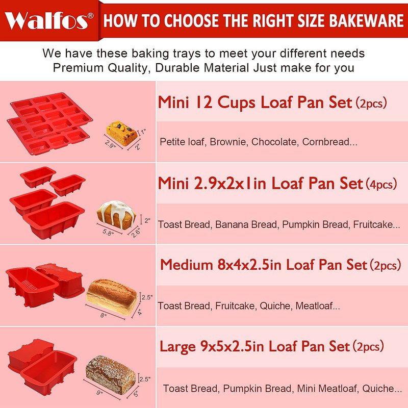- EASY TO USE & RELEASE: Fit perfectly in your oven, just fill the baking pan following recipe instructions, and simply place the pan on a cookie sheet for stability. Walfos flexible silicone mini bread pans offer a non-stick surface that allow the baked goods to pop right out with a little push from the bottom.