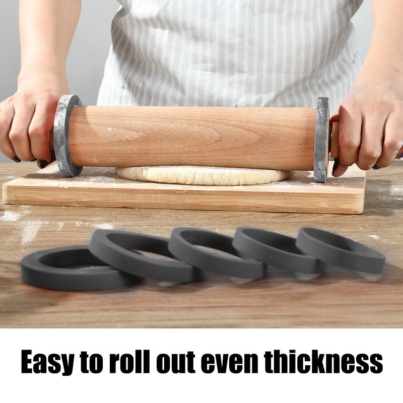 - 【Clear Measurement Guide】There are 5 sizes of the rolling pin thickness rings: 2mm(0.08”), 3mm(0.12”), 5mm(0.2”), 8mm(0.31”), 10mm(0.39”), which is embossed on the inner side of each silicone ring. With the adjustable dough rings, it is easy to roll out dough to the expected even thickness and produce evenly baked bread, biscuit, pie top, tart base, chapatti, dumplings and noodles like pasta.