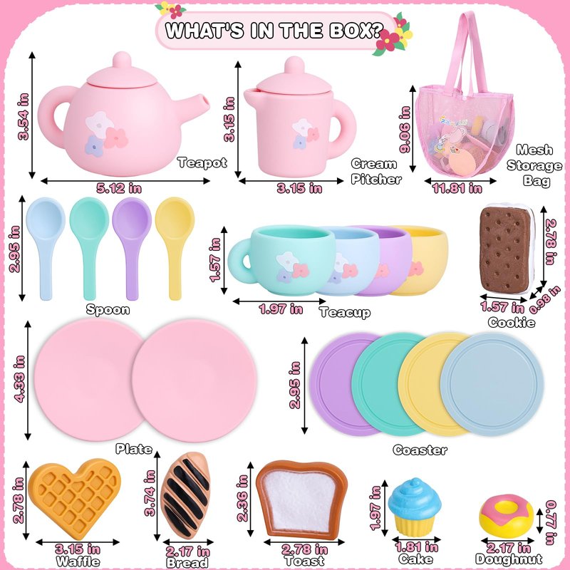 - 【25PCS Kids Pretend Tea Set】Includes 1 teapot,1 cream pitcher,4 teacups,4 spoons,4 coasters, 2 plates,1 cake,1 doughnut,1 bread,1 toast,1 waffle,1 cookie,1 mesh storage bag.Rich pretend tea dessert play food accessories, create hours of fun playtime for toddler
