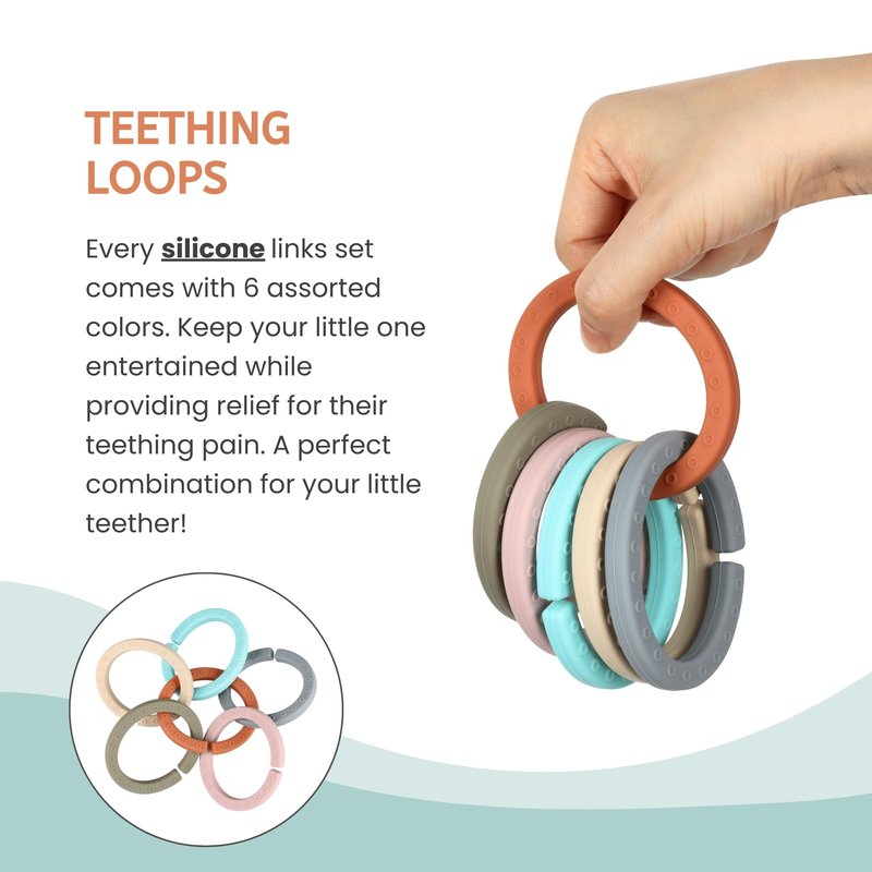 - Easy to Use: Great for the stroller, car seat, tummy time, or any time, the Silicone Teether Links are a lovely addition to all your little one's adventures.
