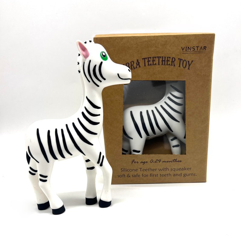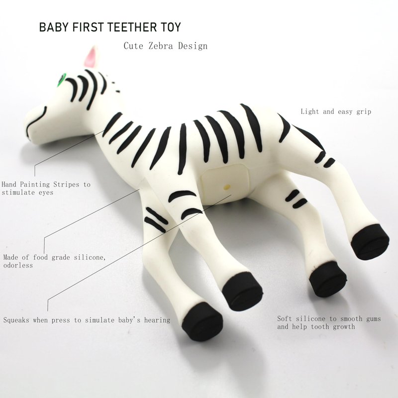 - Zebra Design: The teether is shaped like a cute baby zebra, with attention to detail in its facial features and stripes. The zebra's friendly and whimsical appearance is designed to capture the baby's attention and curiosity.