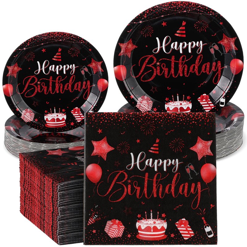 - Voluminous Party Supplies: never fall short of supplies with these red and black plates and napkins party supplies that come in a generous package; Each order includes 60 pieces of birthday paper plates and 60 happy birthday napkins totaling to 120 pieces to ensure a hassle free and enjoyable celebration