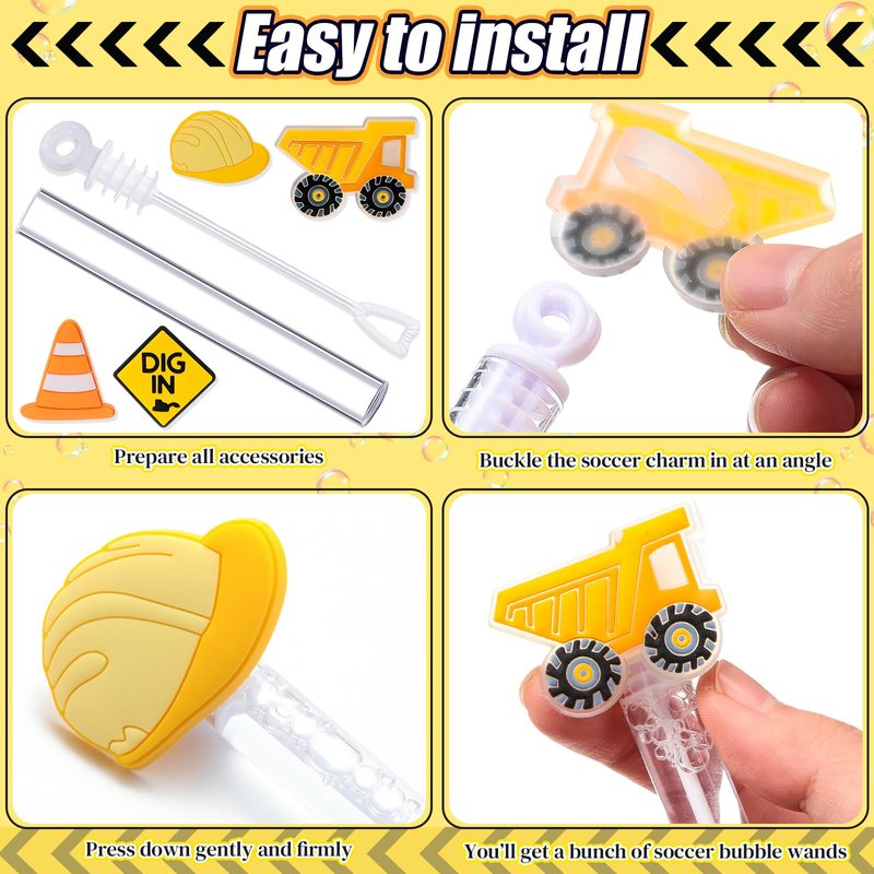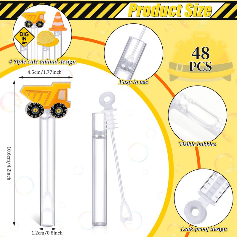 - Unlimited Fun with Construction Bubble Wands Set: this set includes 48 mini bubble wands, each adorning a distinctive construction theme which makes them ideal gift items, particularly those passionate about construction; From construction hats to trucks, roadblocks and road signs, the captivating designs fulfill children's creative desires while ensuring daily entertainment needs
