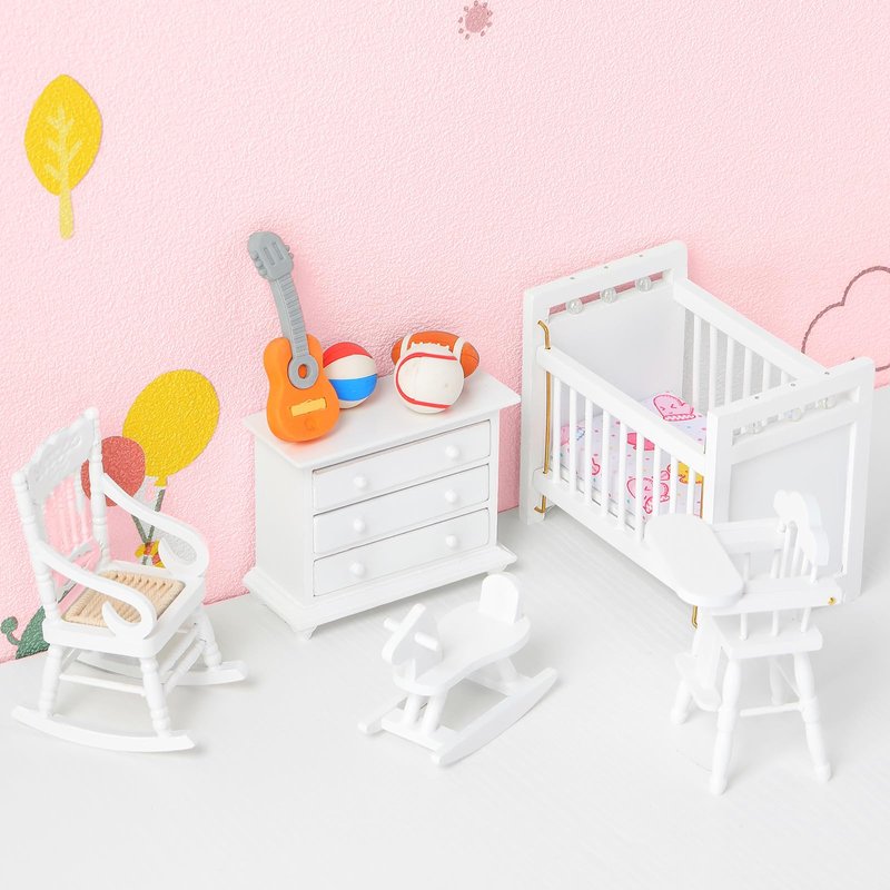 Features: Realistic appearance: These 1: 12 scale dollhouse miniatures with realistic design, which are suitable for interior model, such as doll house, house model or DIY crafts. Classic color: The miniature furniture for doll houses is mainly based on classic white color, adding more charm to the bedroom or living room of the dollhouse. Specifications: Material: wood and fabric Main color: white Size: Bed: 2.76 x 4.41 x 3.23 inches/ 7 x 11.2 x 8.2 cm Cabinet: 3.82 x 1.57 x 2.91 inches/ 9.7 x 4 x 7.4 cm Children's dining chair: 1.85 x 1.69 x 3.94 inches/ 4.7 x 4.3 x 10 cm Rocking chair: 1.97 x 2.64 x 4.02 inches/ 5 x 6.7 x 10.2 cm Rocking horse: 1.38 x 2.76 x 2.28 inches/ 3.5 x 7 x 5.8 cm Package includes: 1 x Bed 1 x Cabinet 1 x Children's dining chair 1 x Rocking chair 1 x Rocking horse Notes: Manual measurement, please allow slight errors on size. The color may exist slight difference due to different screen displays. Suitable for people over 12 years old, and it's recommended to use under the supervision of adults in case of choking risk.