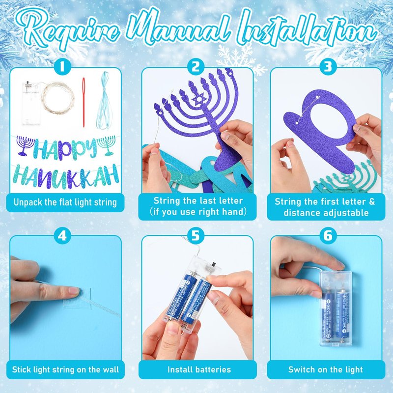 - Easy to Operate: the letters and string lights were pre strung so you don't need to spend your time stringing them together; Just insert 2 AA batteries and press the switch, your light up Hanukkah banner is ready and you can hang it anywhere you want