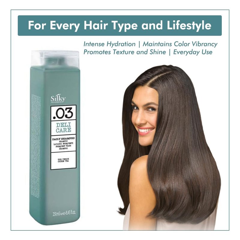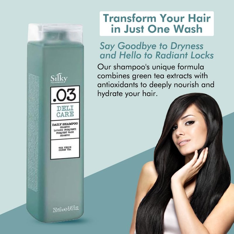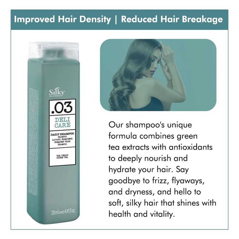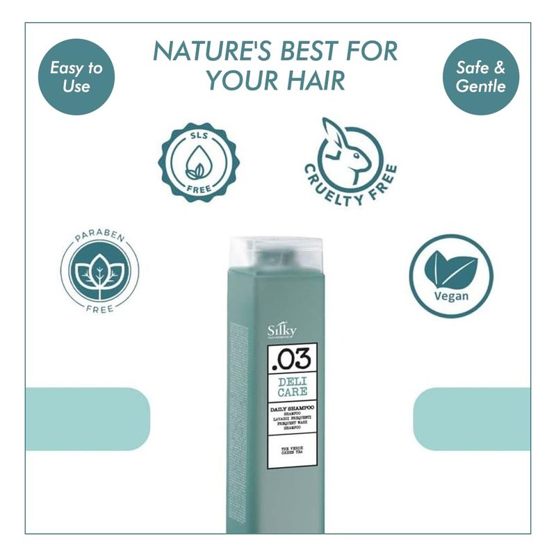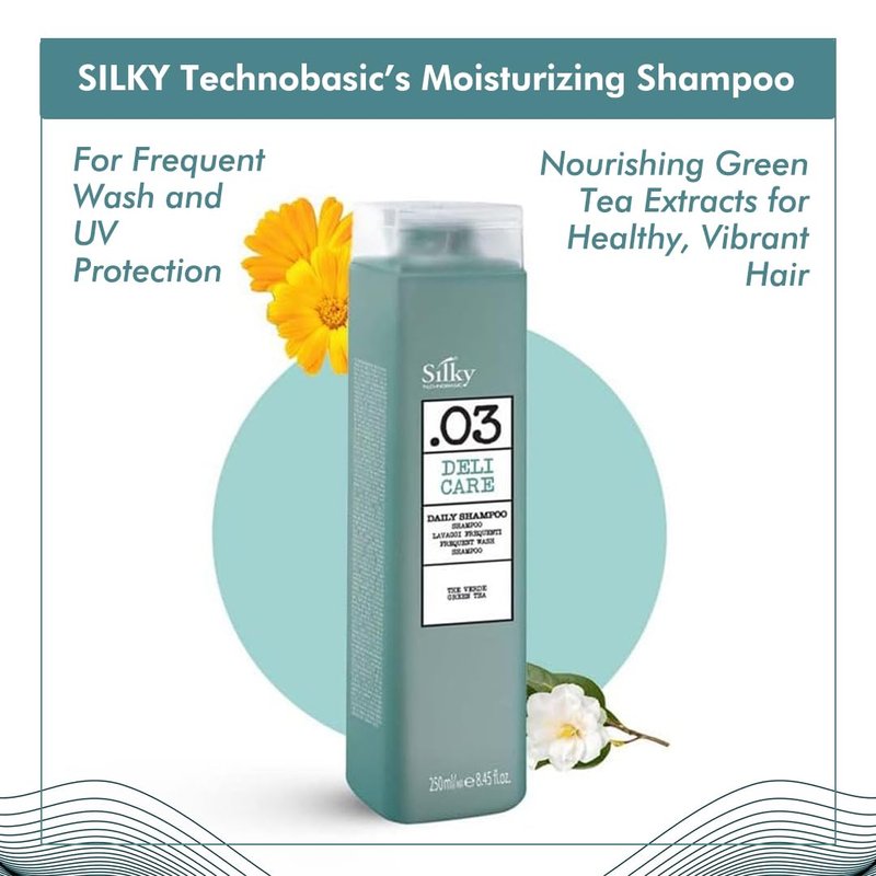 Enjoy the refreshing scent of green tea with every wash of this all natural shampoo and let the powerful blend of natural ingredients and science work their magic. Regular use of our moisturizing shampoo promotes softer, shinier, and more resilient hair, ready to face whatever the day brings. Treat your hair to the care it deserves with SILKY Technobasic’s .03 deli care daily cruelty free shampoo.