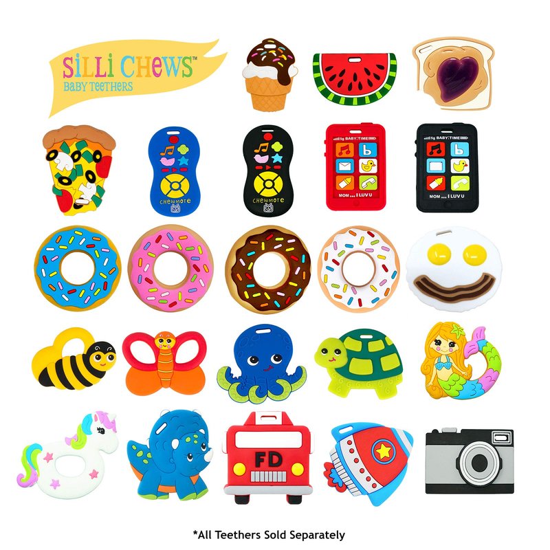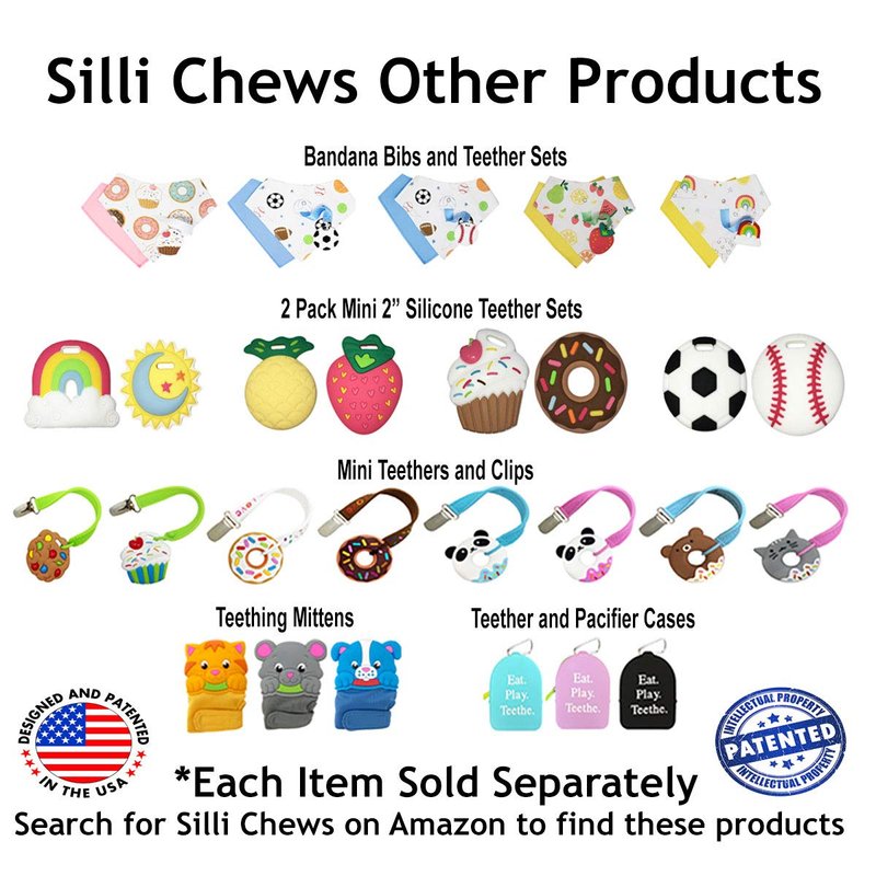- WHY SILLI CHEWS: Add a little "silli" ness to teething. Silli Chews teethers are handmade for all stages of the teething process and feature sweet, silly, playful characters and fun everyday objects in vibrant, eye catching colors. These original silicone teether designs will simultaneously "soothe and amuse" your babies.