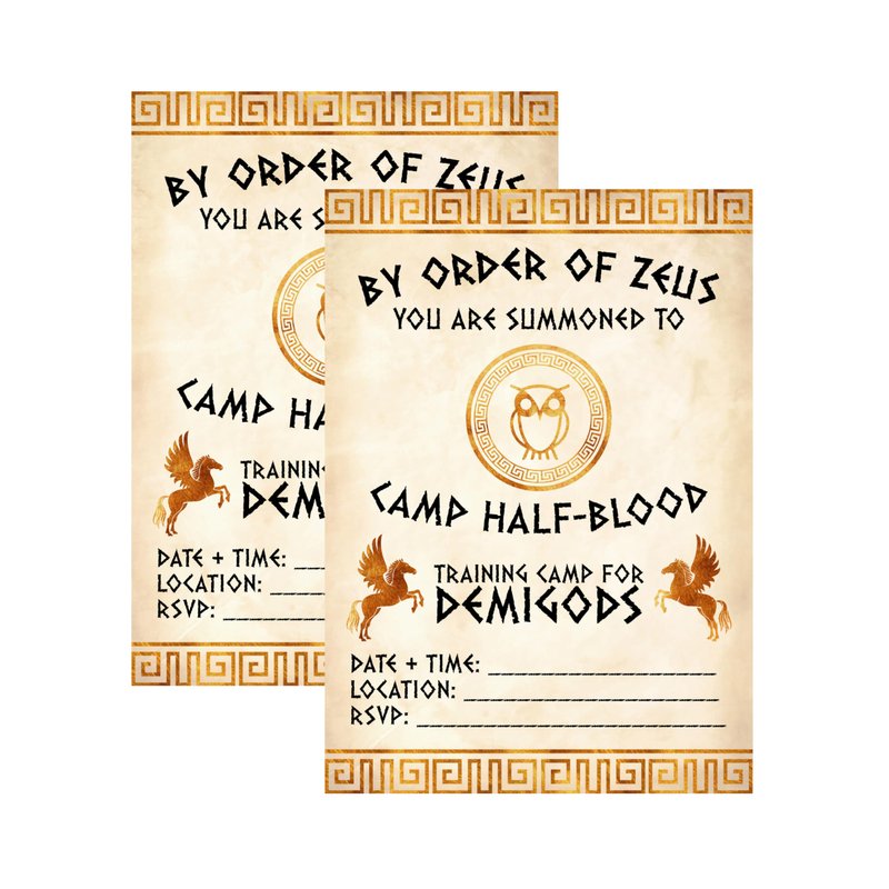 By Order of Zeus You Are Summoned - Greek Mythology Book Themed Kids Party Supply - Camp Half Blood Training Camp for Demigods. Set includes 12 invites and 12 envelopes. Simple to fill in your product details. Blank on the backside for added space. Made in the USA - Designed by Moms